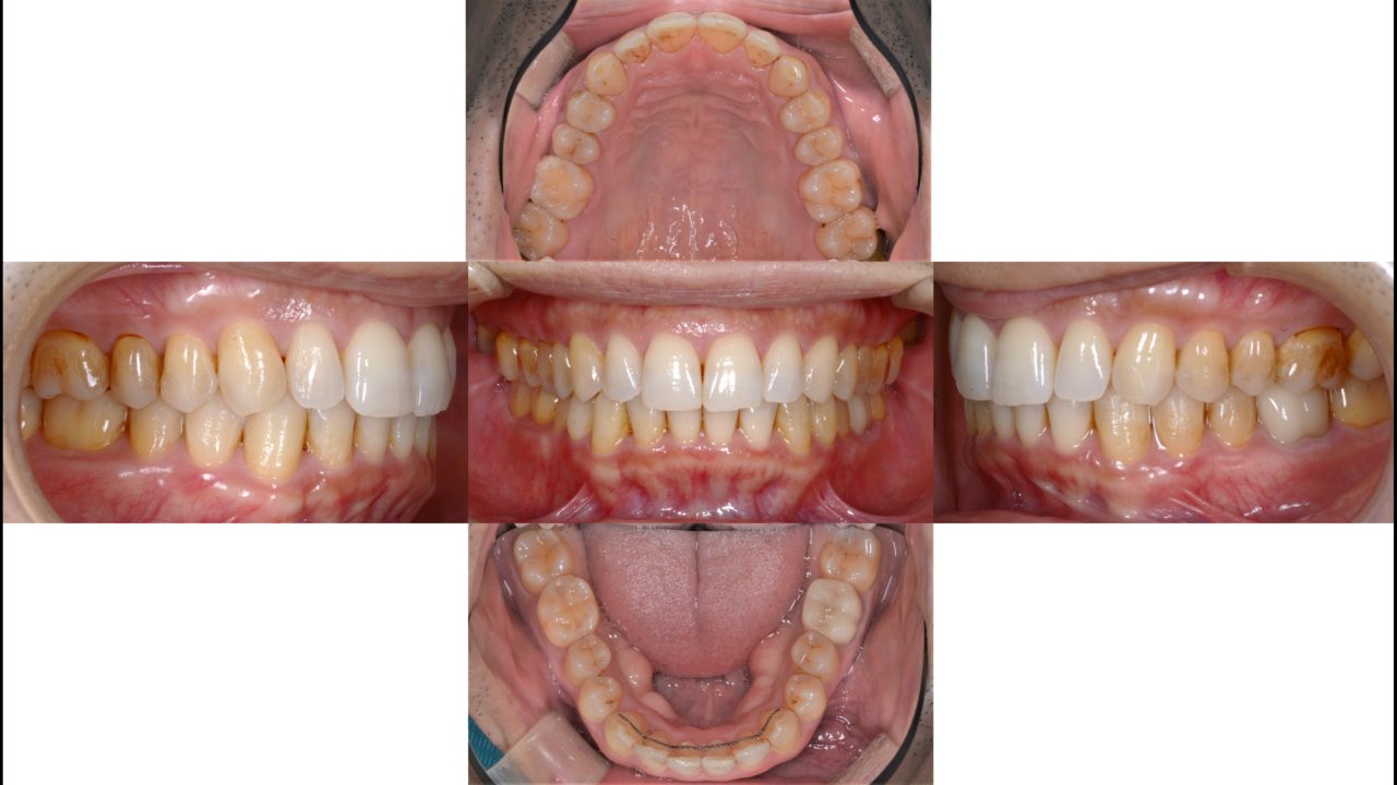 | 備考 | 上下顎の前歯の凸凹を治したいという審美的な主訴でした。 以前に奥様が当院でインビザラインによるマウスピース矯正を受けられ終了しています。 その様子をふまえて、ご主人もマウスピース矯正を希望されました。 前歯の凸凹をまっすく並べるために上下顎共に左右に歯列を拡大しました。 特に上顎は狭い狭窄歯列でしたので、適正な広さに回復しました。 元々上下のバランスは悪くないので、非常にきれいな仕上がりとなりました。 銀歯もすべてセラミックに代え、ホワイトニングもしました。 |