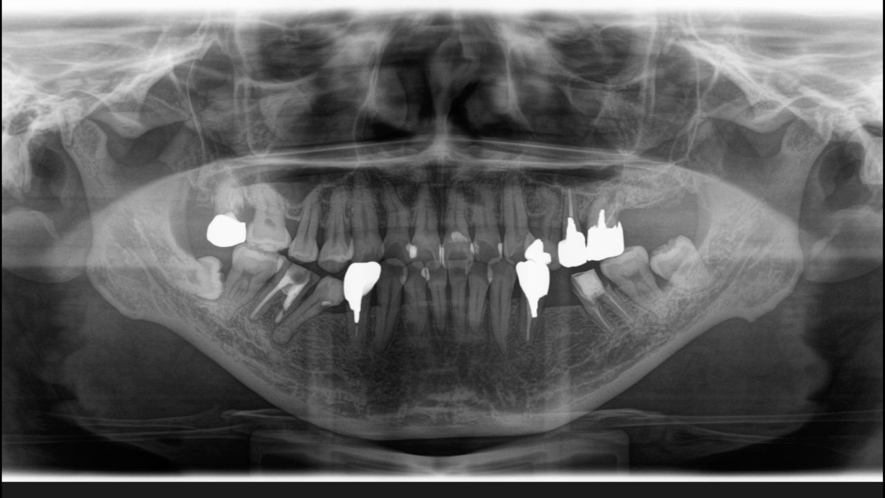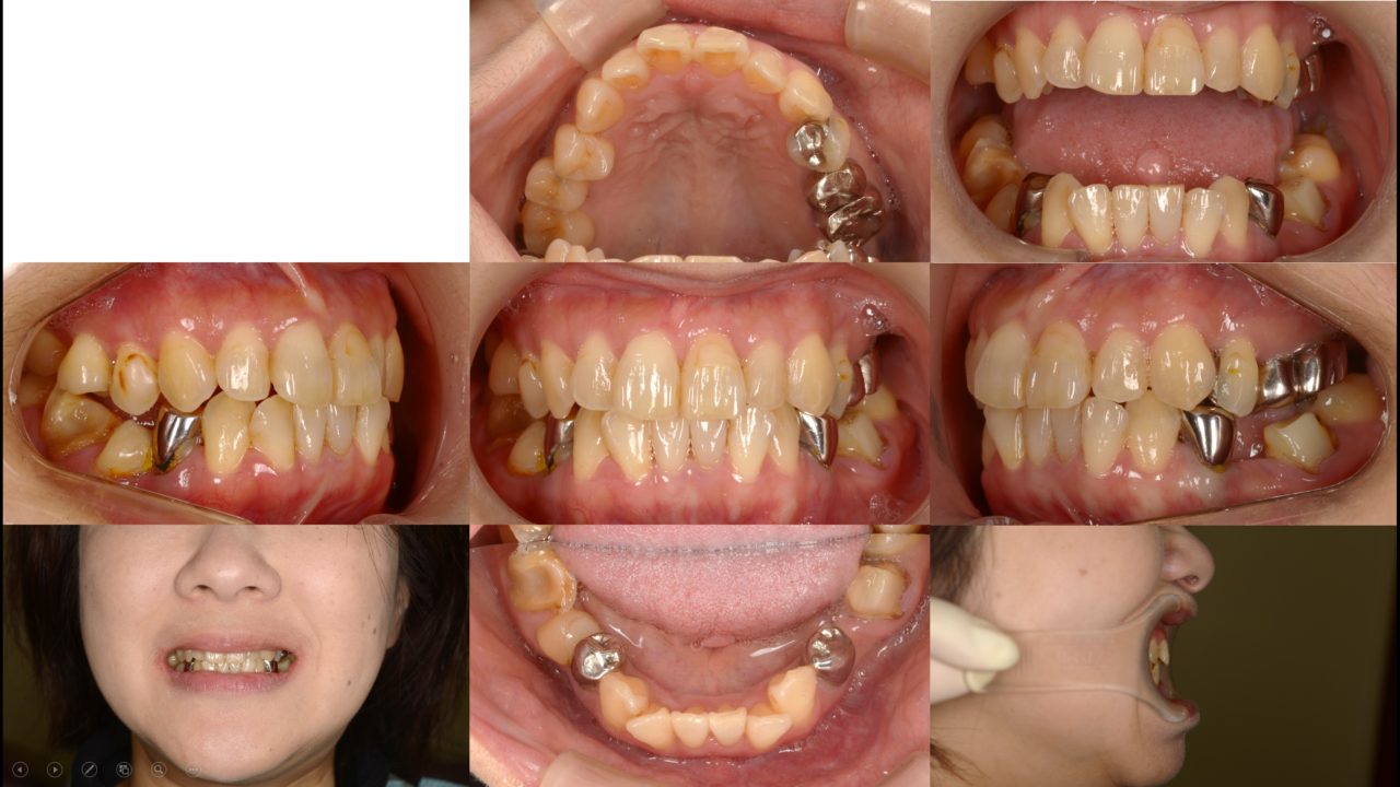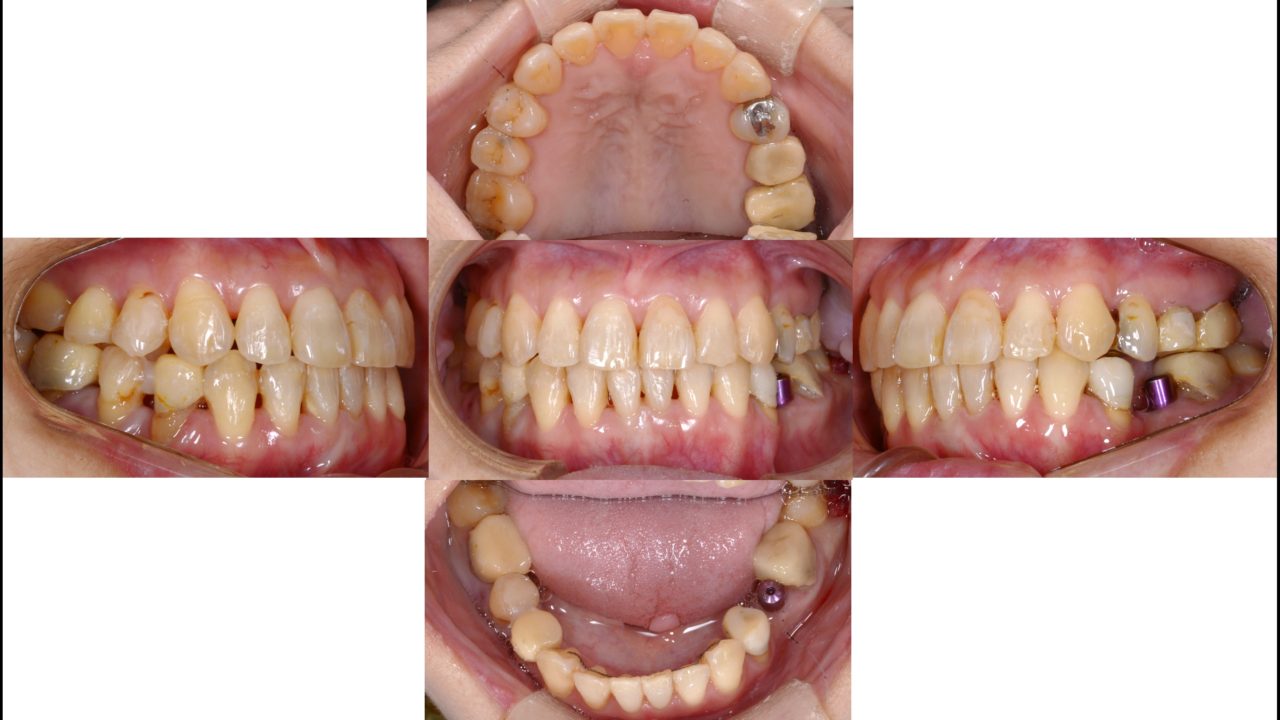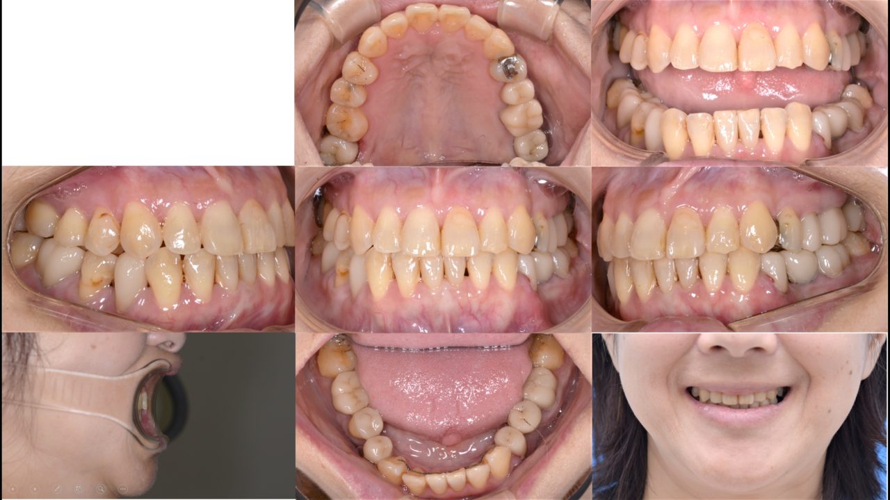 | 備考 | 以前から当院に通院されている方で定期的に奥歯にトラブルを起こしていました。 下顎奥歯が左右ともに傾斜しており、いわゆる「噛み合わせが悪い」状態でした。 20年後までの歯のトラブルを考えて、噛み合わせと昔に治療した冠を全てコーディネートする フルマウスリコンストラクションをすることになりました。 歯の欠損があったので、2本はインプラントをしました。 矯正治療終了後、セラミックによる補綴治療を行い、噛み合わせのしっかりした状態を作りました。 しっかりメインテナンスをできるだけ再治療のない状態を目指します。 |