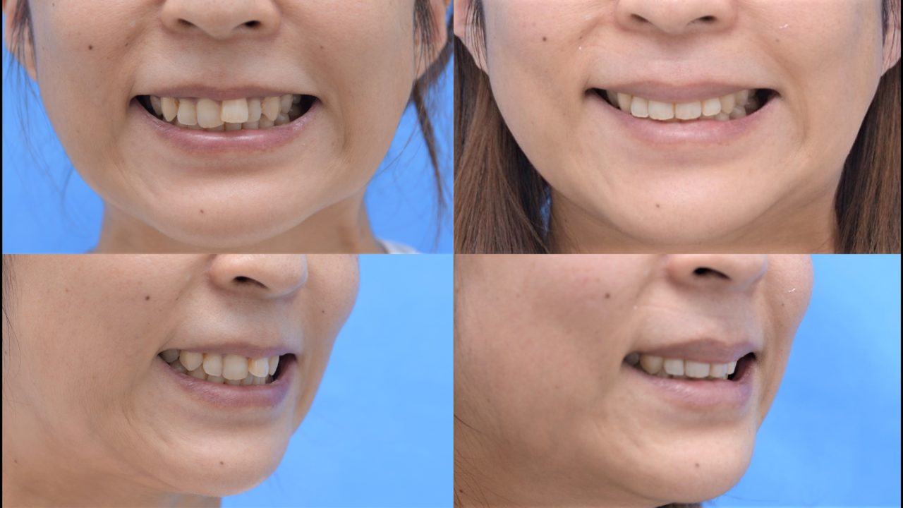 | 備考 | 20歳のころに抜歯矯正を行っていました。保定をしなくなってから、前歯が動き、左上中切歯はかなり前突していました。 長年、気になっていましたが費用が気になり、治療に踏み切ることができませんでした。 再矯正でもあり、費用をできるだけ抑えたいとの希望があったので、上顎前歯のみの部分矯正としました。 全体が前に出ないようにエナメル質を削合するIPRを10本の歯に行いました。 上顎部分矯正の制限がありましたが、審美的、機能的に問題ないレベルまで改善できました。 5か月と短期間で希望通り終了したので、非常に喜んでいただけました。 |